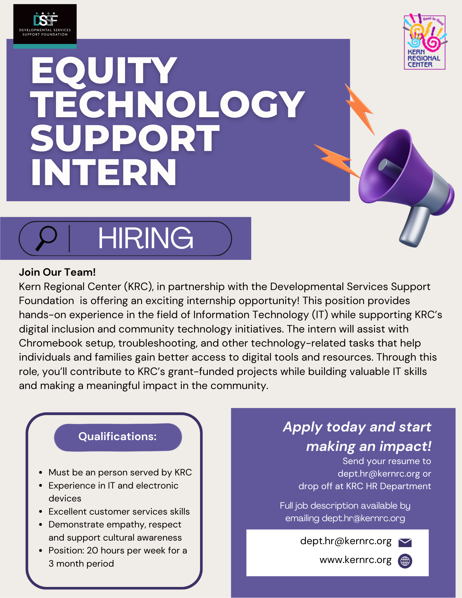 Kern Regional Center is an equal opportunity employer and strives to attract qualified applicants from all walks of life without regard to race, color, ethnicity, religion, national origin, age, sex, sexual orientation, gender identity, gender expression, marital status, ancestry, physical disability, mental disability, medical condition, genetic information, military and veteran status, or any other status protected under federal, state and/or local law. We aim to create an environment that celebrates and embraces the diversity of our workforce. We welcome you to join our team.