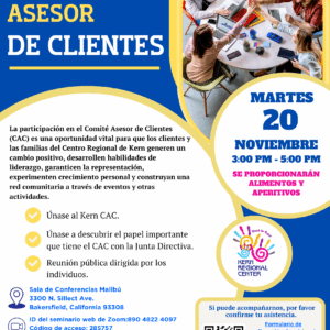 Comite Asesor de Clientes 11/20/25 Ayenda: Enlace https://us02web.zoom.us/j/89048224097?pwd=zNKFqkVKlKlu6AEM9gUwMynhJwegn8.1 ID del seminario web: 890 4822 4097 Código de acceso: ... 20 Nov 3:00 pm - 5:00 pm Kern Regional Center - Malibu Conference Room3200 No. Sillect Avenue Bakersfield, CA 93308