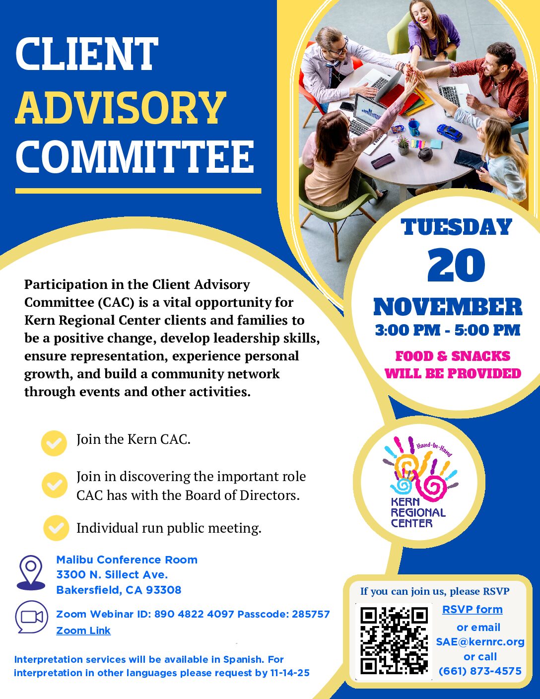Client Advisory Committee 11/20/25 Zoom Info Agenda: Click Here https://us02web.zoom.us/j/89048224097?pwd=zNKFqkVKlKlu6AEM9gUwMynhJwegn8.1 Webinar ID: 890 4822 4097 Passcode: 285757 Or Telephone: ... 20 Nov 3:00 pm - 5:00 pm Kern Regional Center - Malibu Conference Room3200 No. Sillect Avenue Bakersfield, CA 93308
